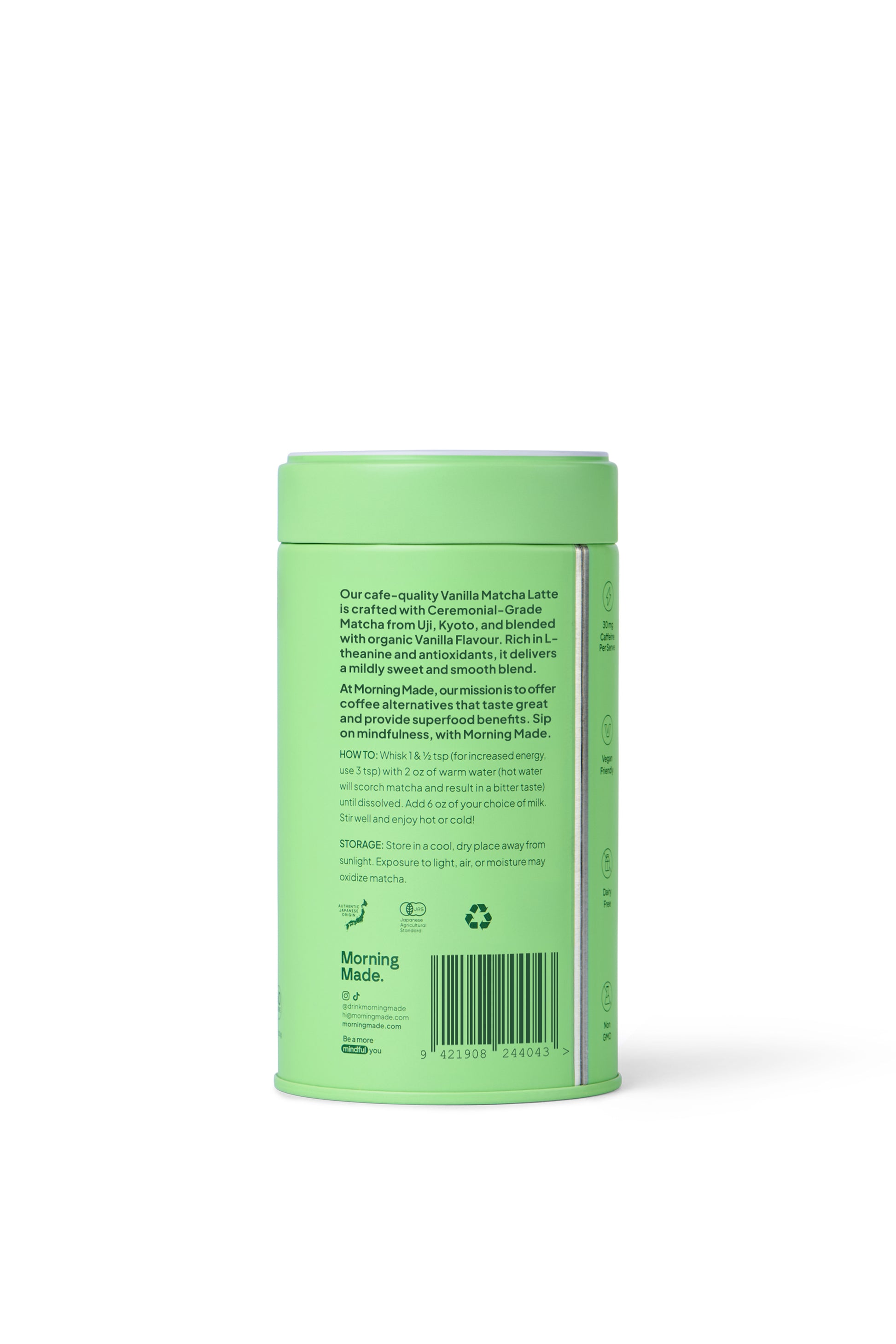 Morning Made Vanilla adds warm vanilla notes to quality matcha for a comforting, cafe-style latte. Just add milk—the ultimate easy matcha.